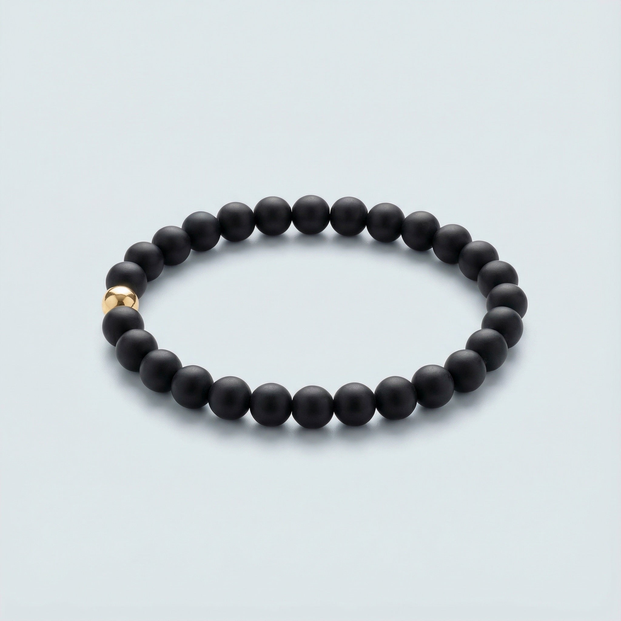 Bracelet features 6mm Matte Black Onyx beads and one 6mm sterling silver or 14K gold-filled accent bead strung on an elastic cord.