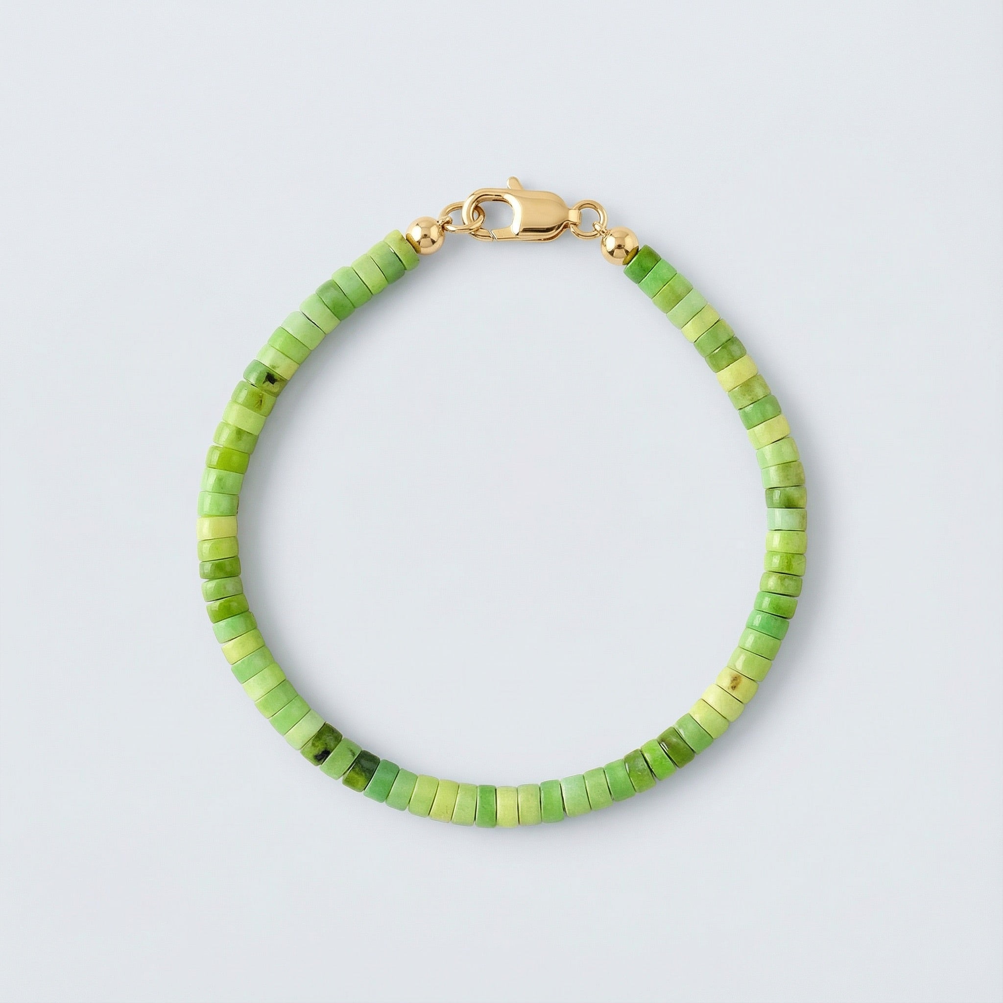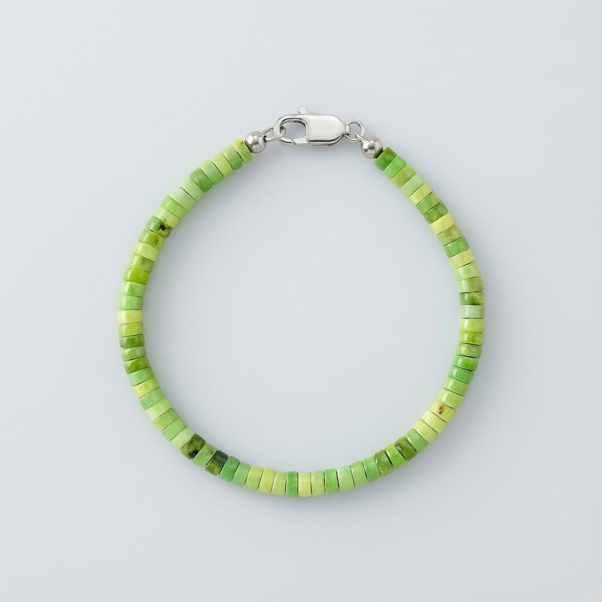 Bracelet features 4mm African Green Chrysoprase heishi beads.