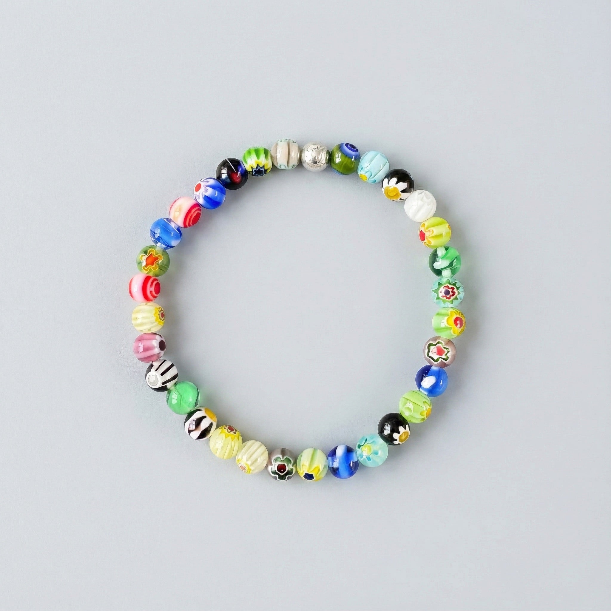 Each Millefiori bracelet is crafted from handmade glass beads created using time-honored Venetian techniques. With vivid color mixes and floral mosaics sealed in every bead, no two bracelets are alike — every piece carries the artistry of a centuries-old craft.