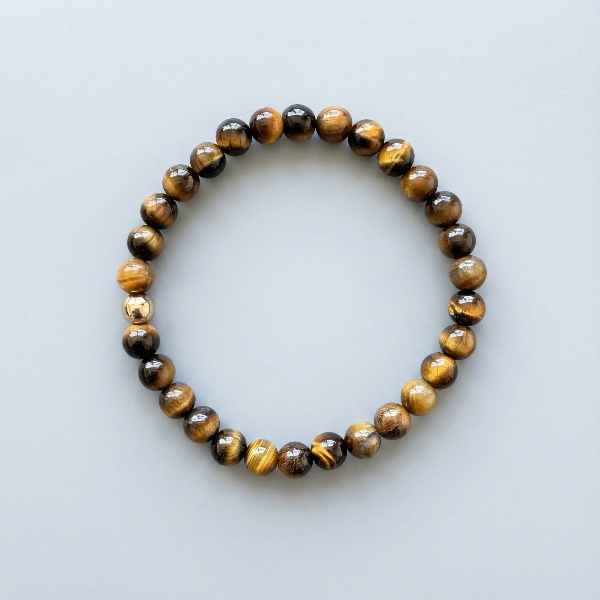 Bracelet features 6mm Tiger's Eye beads and one 6mm sterling silver or 14K gold-filled accent bead strung on an elastic cord.